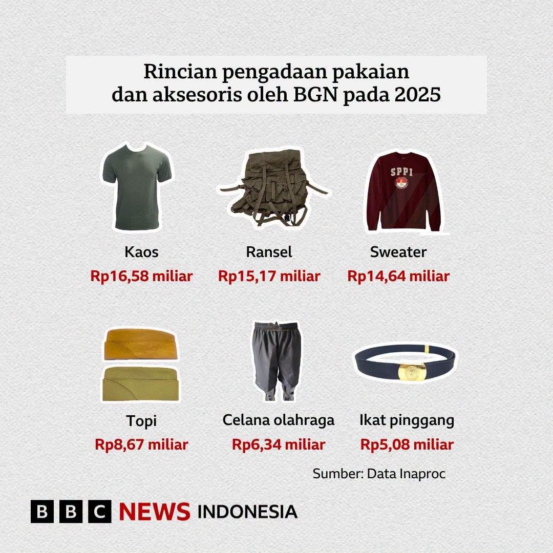 Di tengah pelacakan tablet ini, BBC News Indonesia kembali menemukan pengadaan sejumlah barang yang dinilai pengamat tidak sesuai dengan tujuan MBG yang ingin meningkatkan gizi. Barang-barang itu berupa komponen sandang yang nantinya diperuntukkan bagi para SPPI.