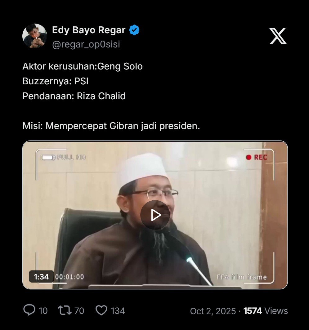 “Jadi sebelum 25 Agustus saya dipanggil mantan Panglima TNI (Jenderal Gatot) di Jogja. Masya Allah, beliau sudah mendeteksi akan terjadi kerusuhan. Siapa aktor intelektualnya? Geng Solo. Buzzer-buzzernya? PSI Partai Solidaritas Indonesia yang diketuai oleh Kaesang. Pendanaannya siapa? Riza Chalid, yang ngerampok Pertamina sampai 1000 Triliun,” ujarnya.