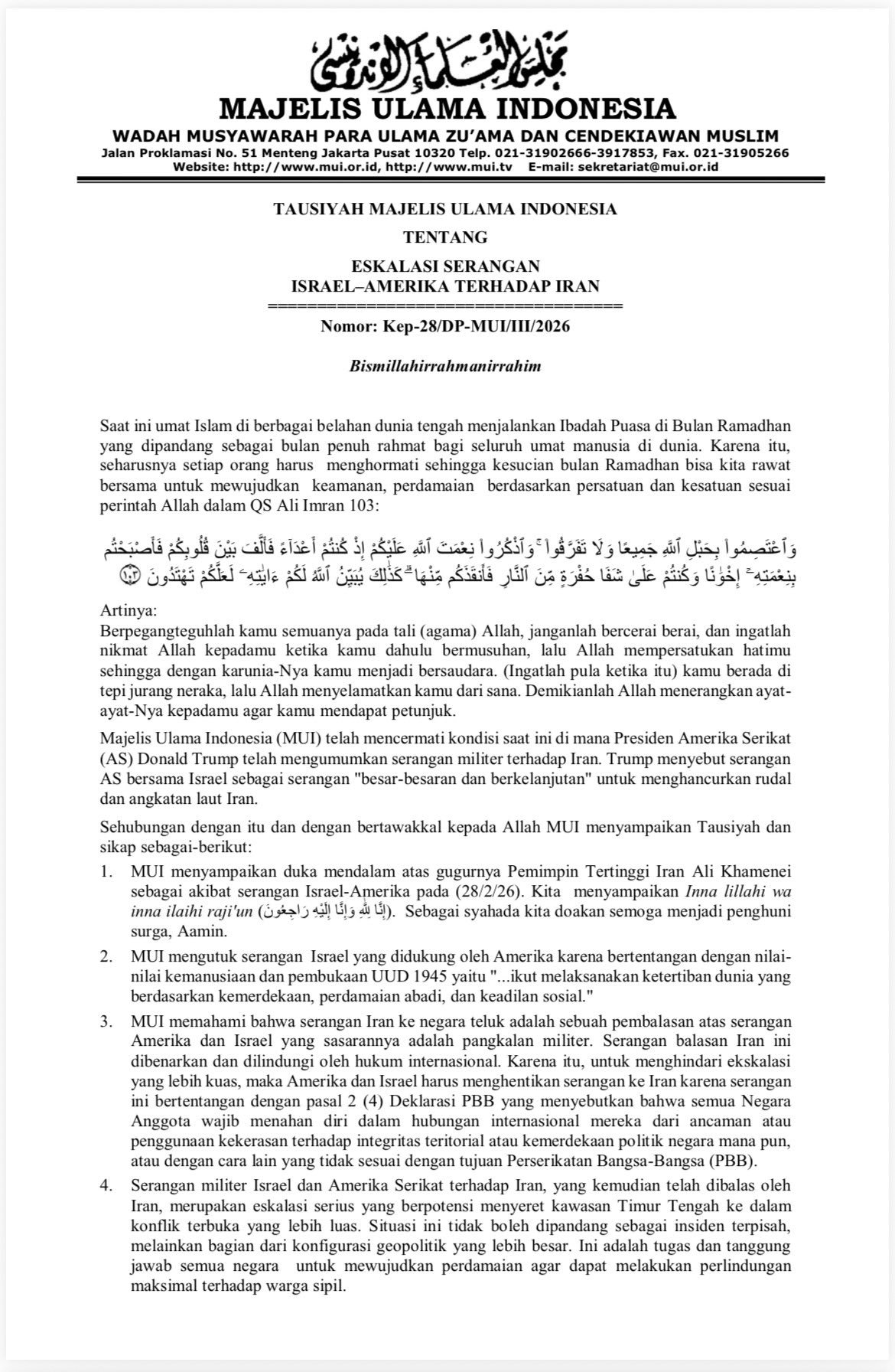 3. MUI memahami bahwa serangan Iran ke negara teluk adalah sebuah pembalasan atas serangan Amerika dan Israel yang sasarannya adalah pangkalan militer. Serangan balasan Iran ini dibenarkan dan dilindungi oleh hukum internasional. Karena itu, untuk menghindari eskalasi yang lebih luas, maka Amerika dan Israel harus menghentikan serangan ke Iran karena serangan ini bertentangan dengan pasal 2 (4) Deklarasi PBB yang menyebutkan bahwa semua Negara Anggota wajib menahan diri dalam hubungan internasional mereka dari ancaman atau penggunaan kekerasan terhadap integritas teritorial atau kemerdekaan politik negara mana pun, atau dengan cara lain yang tidak sesuai dengan tujuan Perserikatan Bangsa-Bangsa (PBB).