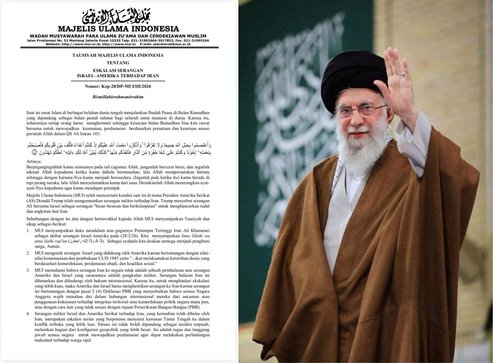 1. MUI menyampaikan duka mendalam atas gugurnya Pemimpin Tertinggi Iran Ali Khamenei sebagai akibat serangan Israel-Amerika pada (28/2/26). Kita menyampaikan inna lillahi wa inna ilaihi rajiun. Sebagai syuhada, kita doakan semoga menjadi penghuni surga. Aamiin.