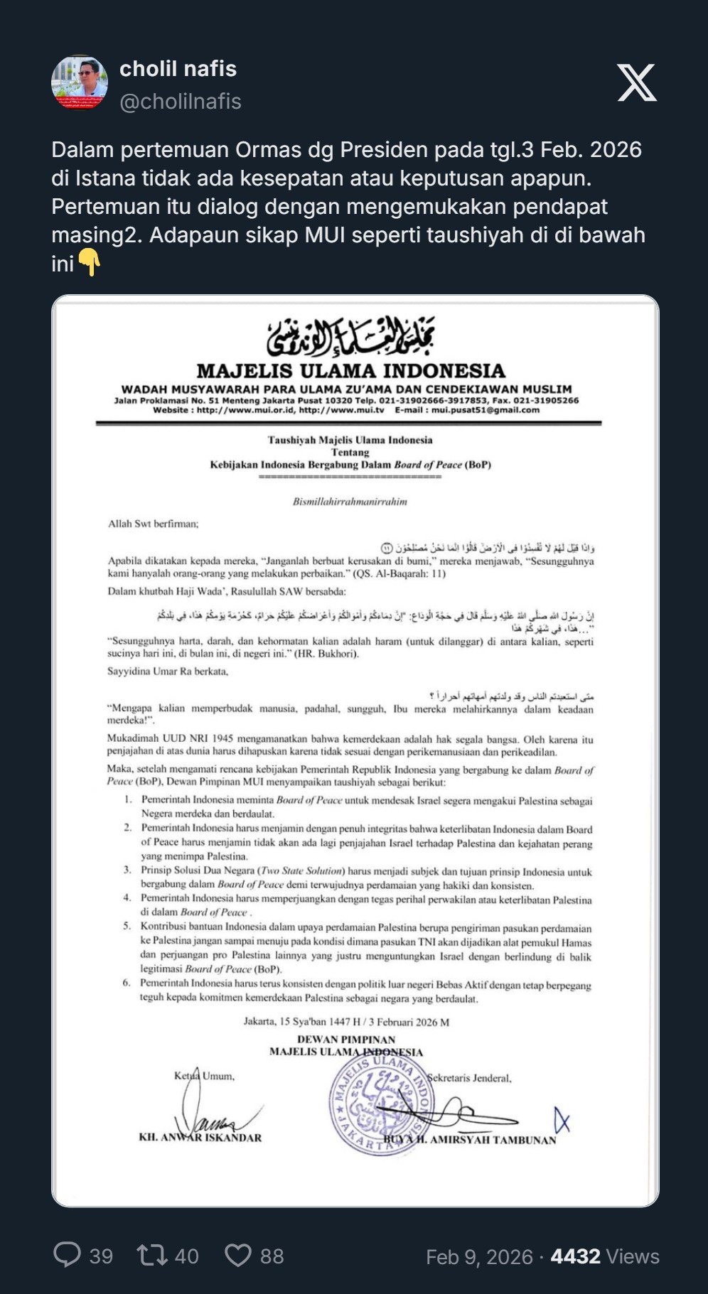 “Dalam pertemuan Ormas dengan Presiden pada tgl.3 Feb. 2026 di Istana tidak ada kesepatan atau keputusan apapun. Pertemuan itu dialog dengan mengemukakan pendapat masing-masing. Adapaun sikap MUI seperti taushiyah di di bawah ini👇,” kata Kyai Cholil Nafis di akun media sosialnya, Senin (9/2/2026).