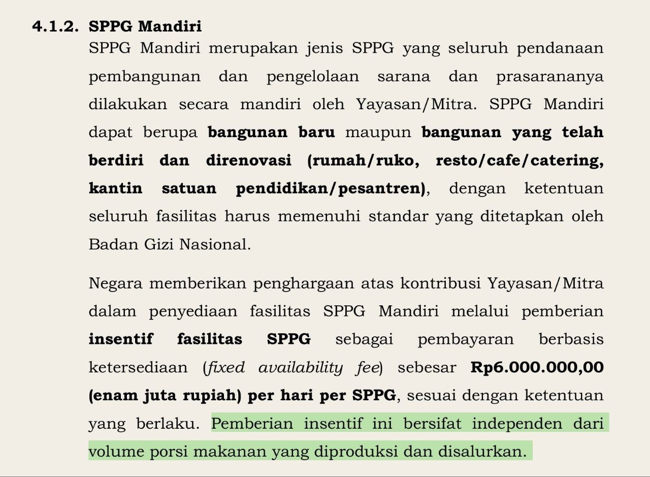 Rp6 juta/hari/dapur adalah jaminan pendapatan tetap buat pemilik dapur karena ternyata basis pembayarannya adalah ketersediaan (fixed availability fee)—kasarnya negara bayar sewa dapur. Insentif ini sifatnya independen, tak peduli berapa pun volume porsi makanan yang diproduksi dan dibagikan. Ingat, insentif ini berbeda dengan biaya bahan baku, operasional porsi, dsb.