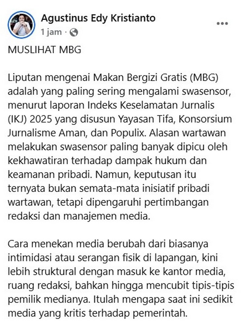 Liputan mengenai Makan Bergizi Gratis (MBG) adalah yang paling sering mengalami swasensor, menurut laporan Indeks Keselamatan Jurnalis (IKJ) 2025 yang disusun Yayasan Tifa, Konsorsium Jurnalisme Aman, dan Populix. Alasan wartawan melakukan swasensor paling banyak dipicu oleh kekhawatiran terhadap dampak hukum dan keamanan pribadi. Namun, keputusan itu ternyata bukan semata-mata inisiatif pribadi wartawan, tetapi dipengaruhi pertimbangan redaksi dan manajemen media.