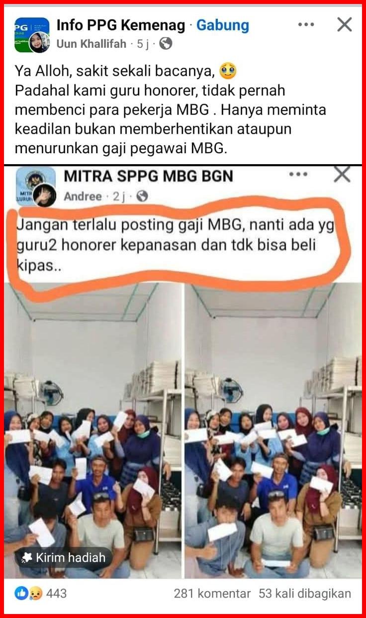 Padahal kami guru honorer, tidak pernah membenci para pekerja MBG. Hanya meminta keadilan bukan memberhentikan ataupun menurunkan gaji pegawai MBG,” komen seorang guru honorer.