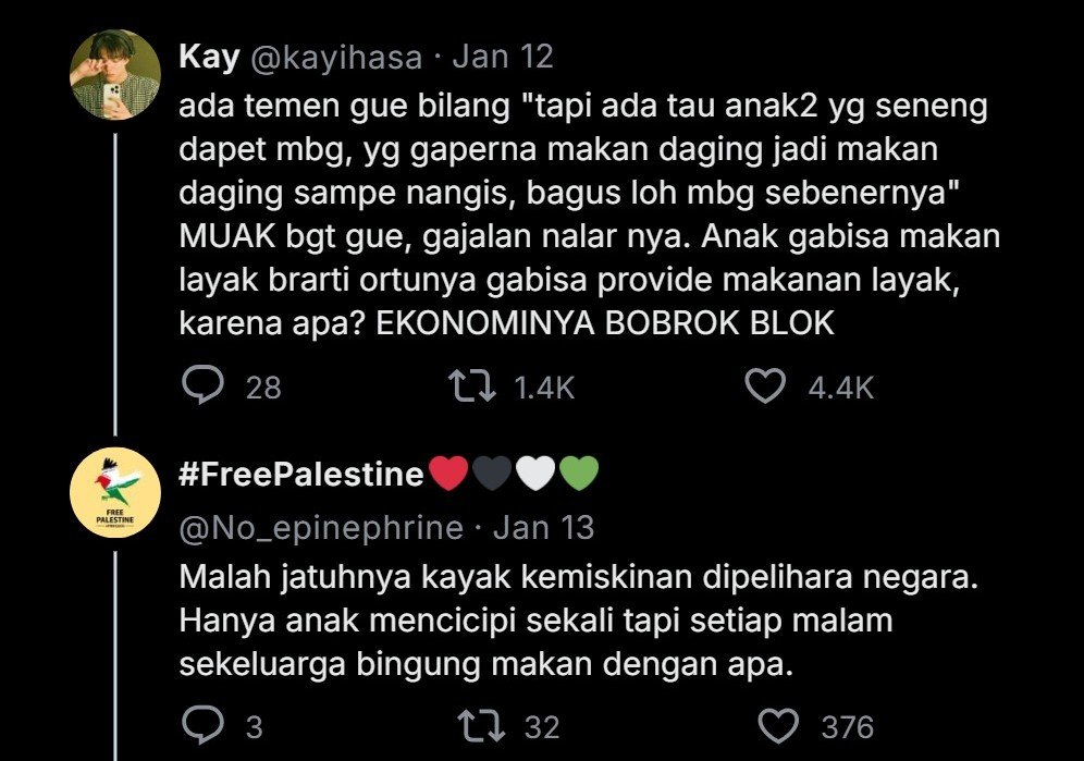 Ada temen gue bilang “tapi ada tau anak2 yg seneng dapet MBG, yg gaperna makan daging jadi makan daging sampe nangis, bagus loh MBG sebenernya”. MUAK banget gue, gajalan nalar nya. Anak ga bisa makan layak berarti ortunya gabisa provide (menyediakan) makanan layak, karena apa? EKONOMINYA BOBROK, BLOK!