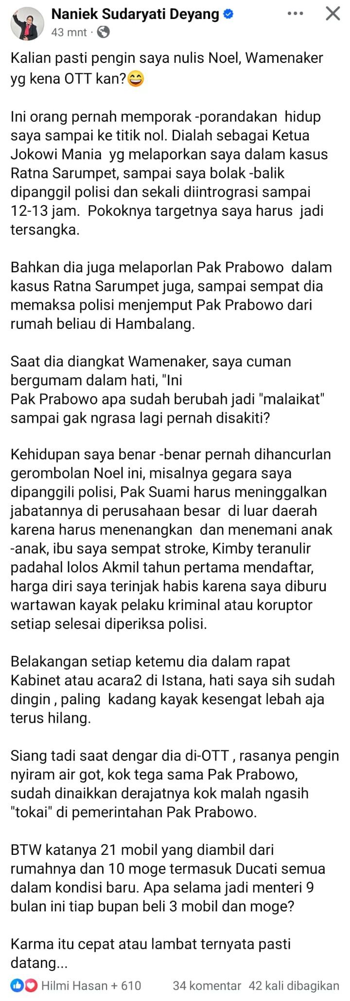 Ini orang pernah memporak-porandakan hidup saya sampai ke titik nol. Dialah sebagai Ketua Jokowi Mania yg melaporkan saya dalam kasus Ratna Sarumpaet, sampai saya bolak-balik dipanggil polisi dan sekali diintrograsi sampai 12-13 jam. Pokoknya targetnya saya harus jadi tersangka.