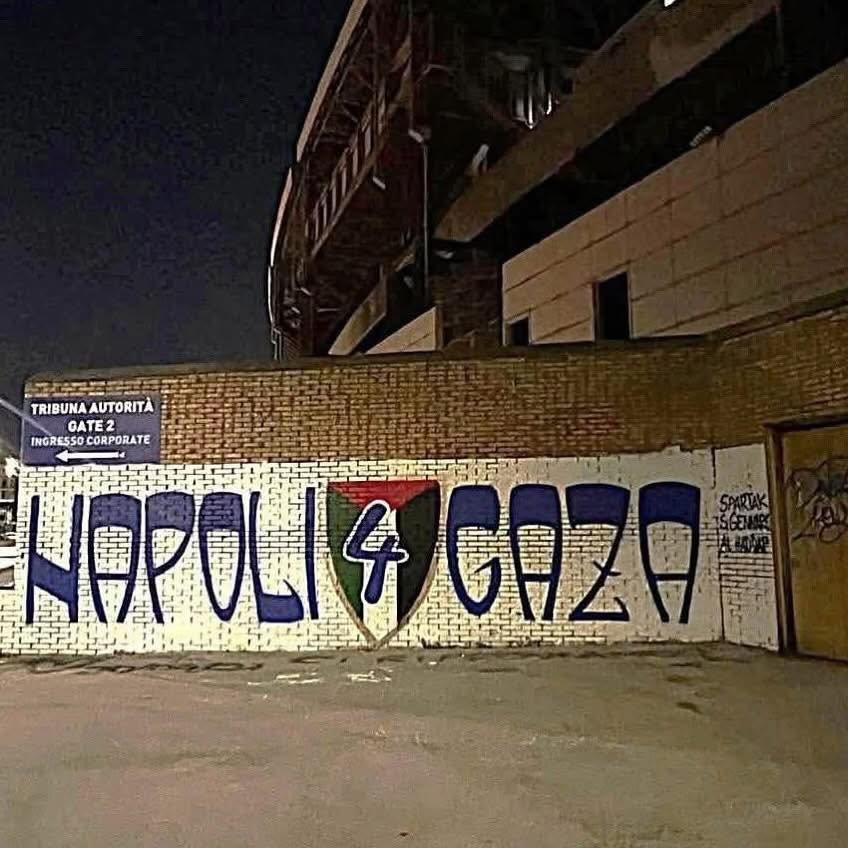Saat tim sepak bola Napoli menjuarai liga, para penggemar mengibarkan bendera Palestina sebagai bentuk dukungan kemanusiaan dan solidaritas terhadap masyarakat Palestina yang menderita di Gaza.