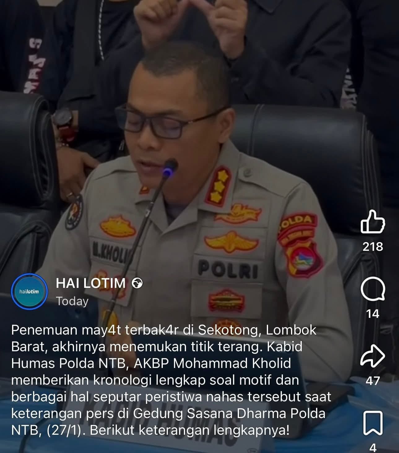 “Sehingga, (pelaku) merasa sakit hati dan terjadilah peristiwa pembunuhan tersebut,” kata Kabid Humas Polda NTB Kombes Mohammad Kholid, dilansir detik.com, Selasa (27/1/2026).