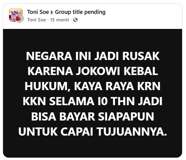 NEGARA INI JADI RUSAK KARENA JOKOWI KEBAL HUKUMAdminSenin, 6 Oktober, 2025Senin, 6 Oktober, 2025SOSIAL MEDIA “NEGARA INI JADI RUSAK KARENA JOKOWI KEBAL HUKUM, KAYA RAYA KRN KKN SELAMA I0 THN JADI BISA BAYAR SIAPAPUN UNTUK CAPAI TUJUANNYA.” (Toni Soe) Jangan LewatkanEmang bajigur itu partaiDaerah sendiri kebanjiran, KDM malah pencitraan ke Sumatera, Kelakuan Gubernur Konten ini bikin muak netizenSelebritis kompak menghujat aksi pencitraan Zulhas panggul berasDi saat bencana Sumatera belum reda, Kemenhan malah posting pejabatnya asyik main tenis, dihujat netizen akhirnya dihapusPenyebab banjir, Nyoblos sembarangan..Emang paling enak ngecounter congor kader PSI ya tinggal lihat jejak digitalnya, manusia-manusia munafik gak punya malu, muka badak