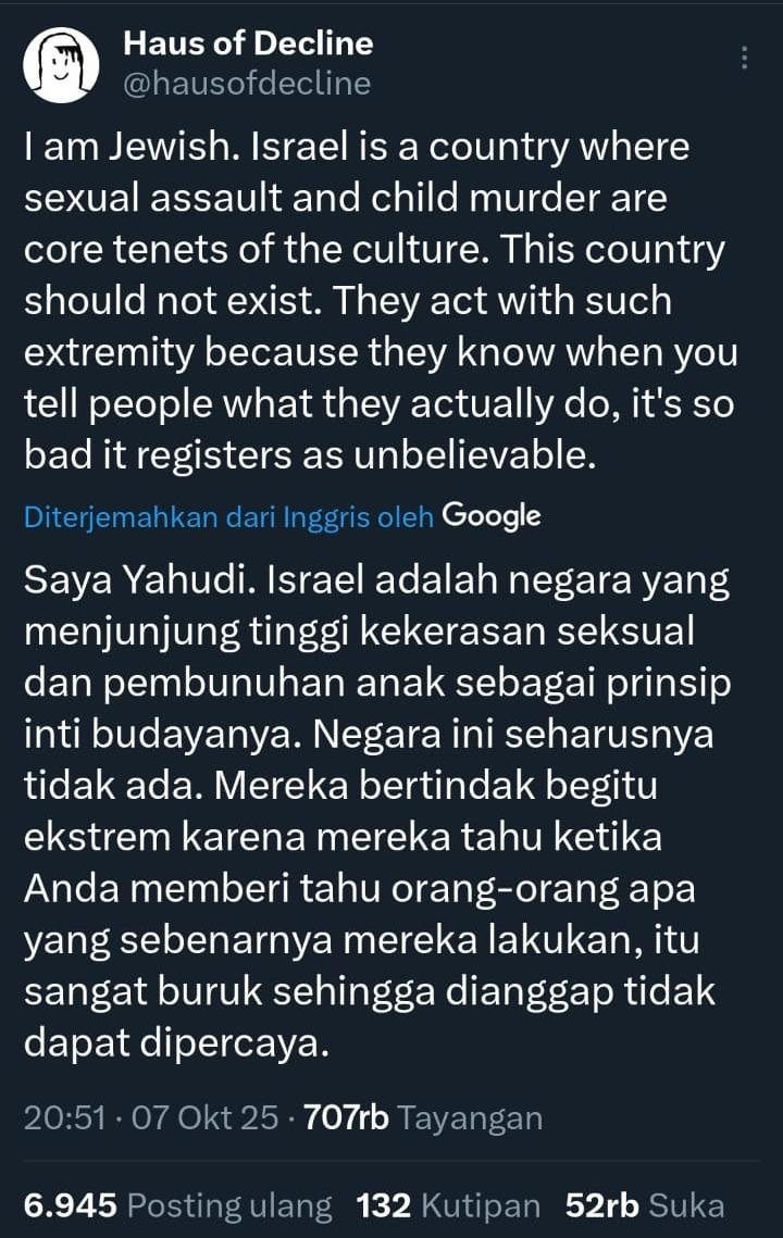 - Saya seorang Yahudi. Israel adalah negara yang menjunjung tinggi kekerasan seksual dan pembunuhan anak sebagai prinsip inti budayanya. Negara ini seharusnya tidak ada. Mereka bertindak begitu ekstrem karena mereka tahu ketika Anda memberi tahu orang-orang apa yang sebenarnya mereka lakukan, itu sangat buruk sehingga terasa tak masuk akal.