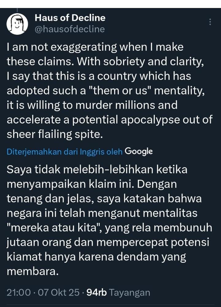 - Saya tidak melebih-lebihkan ketika saya membuat klaim ini. Dengan tenang dan jelas, saya katakan bahwa ini adalah negara yang telah mengadopsi mentalitas “mereka atau kita”, mereka bersedia membunuh jutaan orang dan mempercepat potensi kiamat hanya karena dendam yang membara.
