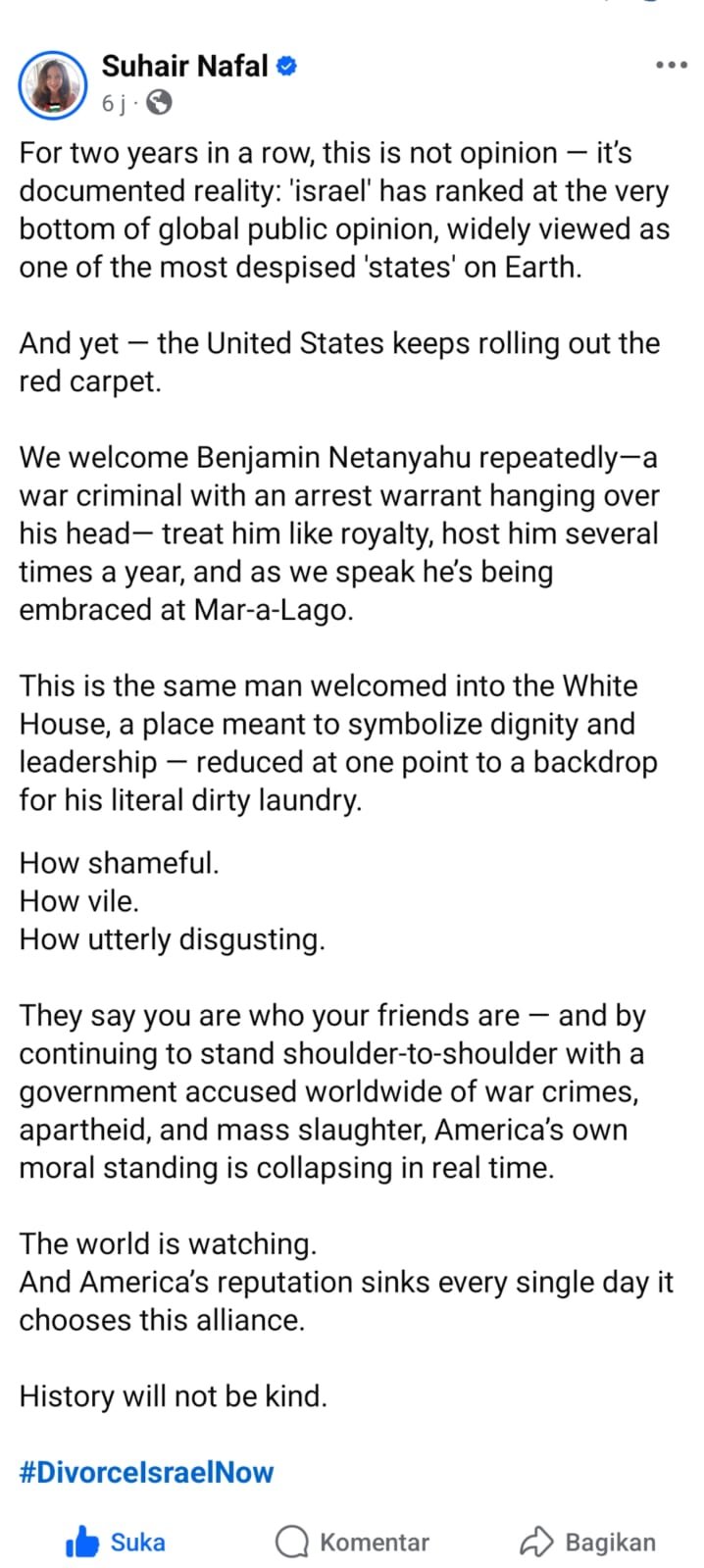 Sungguh menjijikkan. Mereka bilang, siapa dirimu ditentukan oleh siapa teman-temanmu — dan dengan terus berdiri bahu-membahu dengan pemerintah yang dituduh di seluruh dunia melakukan kejahatan perang, apartheid, dan pembantaian massal, kedudukan moral Amerika sendiri runtuh secara nyata.