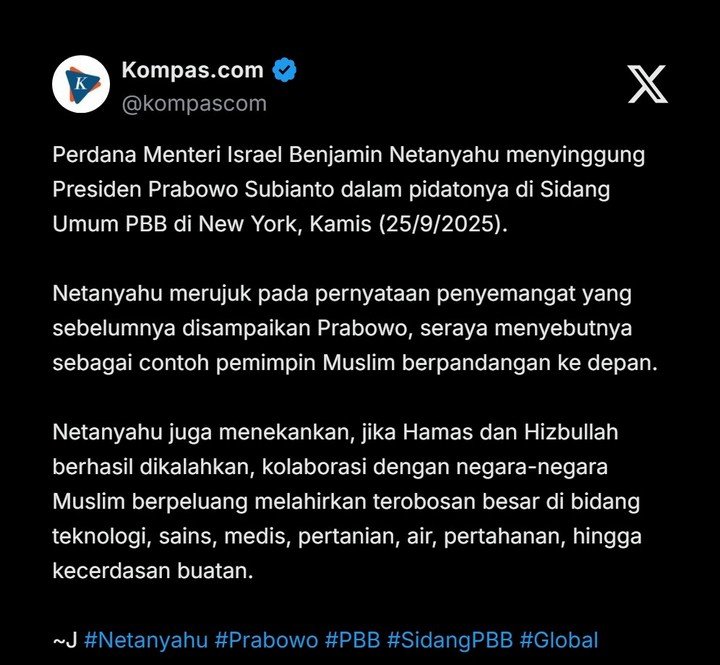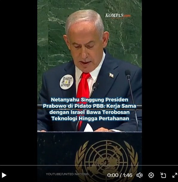 🔴Perdana Menteri Israel Benjamin Netanyahu memuji Presiden Prabowo Subianto dalam pidatonya di Sidang Umum PBB di New York, Kamis (25/9/2025).
