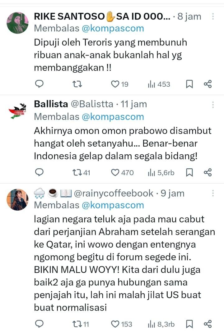 Netanyahu merujuk pada pernyataan penyemangat yang sebelumnya disampaikan Prabowo, seraya menyebutnya sebagai contoh pemimpin Muslim berpandangan ke depan.