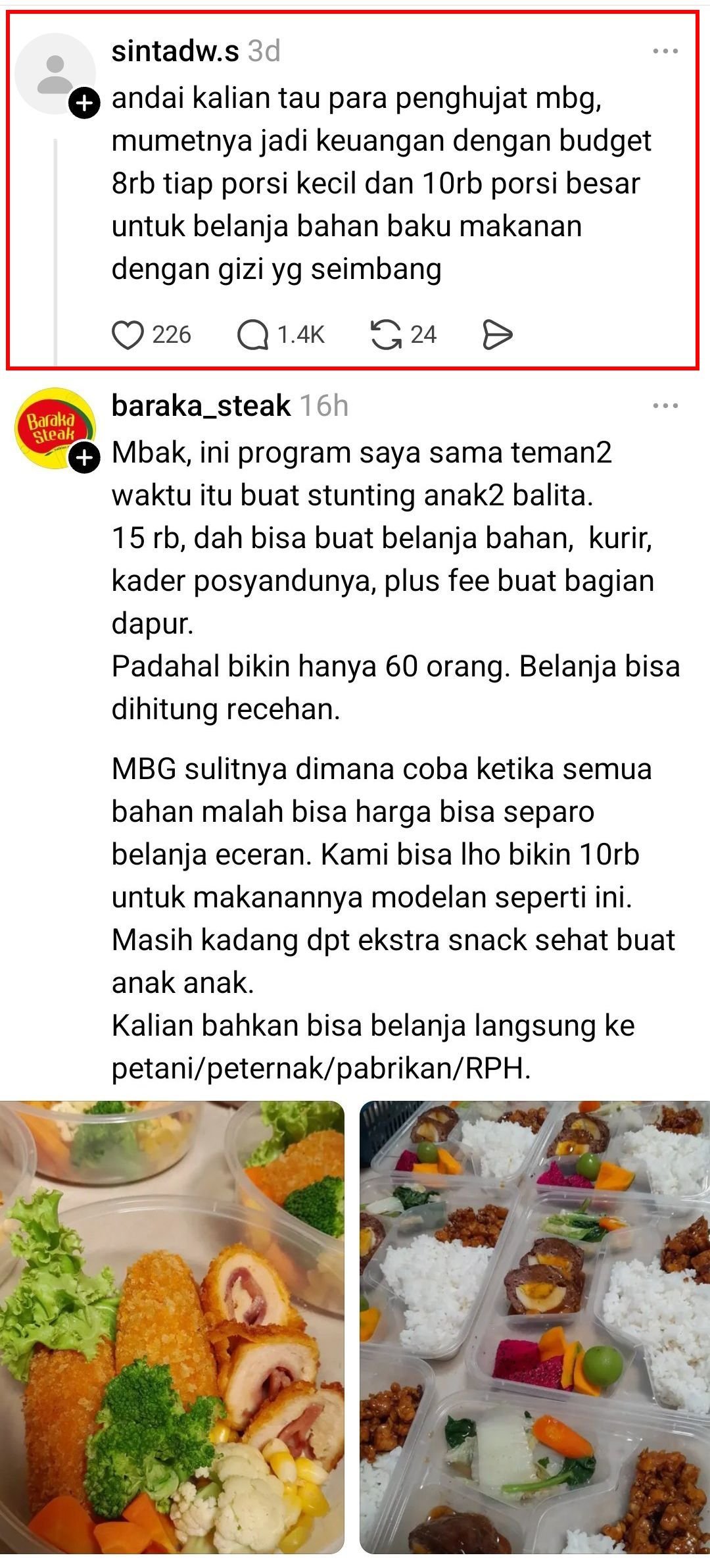 👨🦱 : Mbak, ini program saya sama teman2 waktu itu buat stunting anak2 balita. 15 rb, dah bisa buat belanja bahan, kurir, kader posyandunya, plus fee buat bagian dapur. Padahal bikin hanya 60 orang. Belanja bisa dihitung recehan. MBG sulitnya dimana coba ketika semua bahan malah bisa harga bisa separo belanja eceran. Kami bisa lho bikin 10rb untuk makanannya modelan seperti ini. Masih kadang dpt ekstra snack sehat buat anak anak. Kalian bahkan bisa belanja langsung ke petani/peternak/pabrikan/RPH.
