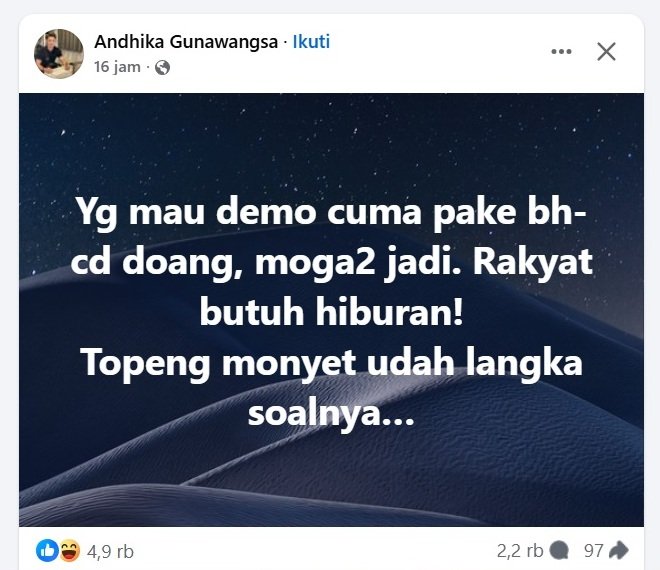 “Yg mau demo cuma pake bh-cd doang, moga2 jadi. Rakyat butuh hiburan! Topeng monyet udah langka soalnya…,” ujar akun fb Andhika Gunawangsa.