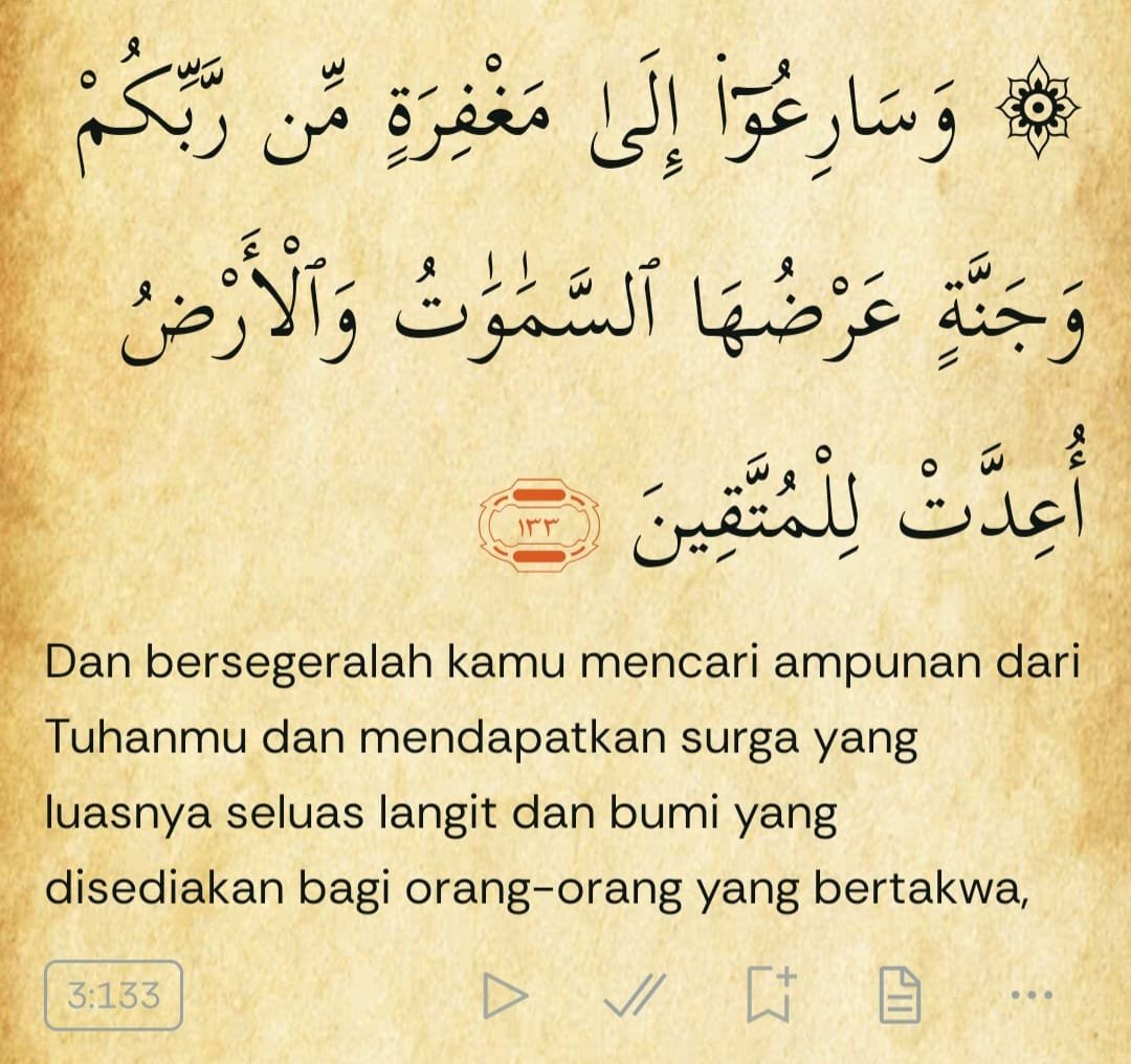 “Dan bersegeralah kamu kepada ampunan dari Tuhanmu dan kepada surga yang luasnya seluas langit dan bumi yang disediakan untuk orang-orang yang bertakwa.”