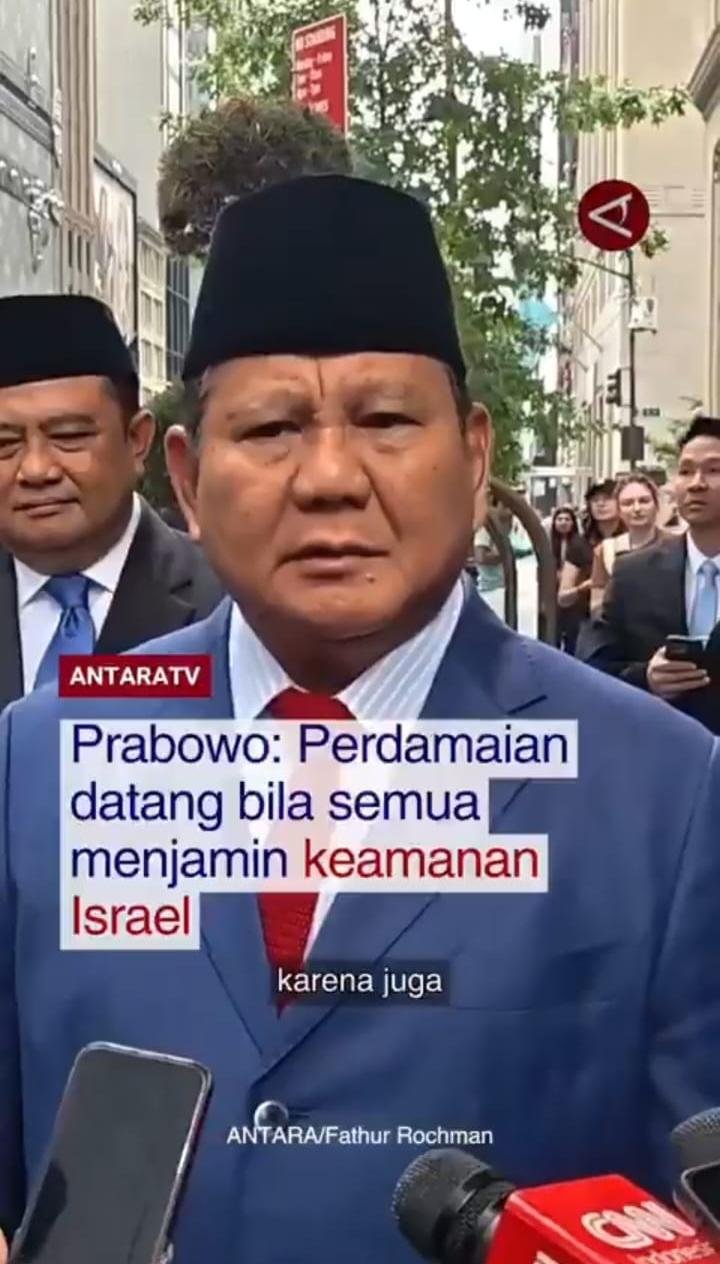 “Banyak sekali yang positif (menanggapi pidato Prabowo di PBB), karena juga kita dianggap realistis, kita dianggap seimbang. Saya juga terang-terangan mengatakan perdamaian hanya bisa datang kalau semua orang mengakui, menghormati, dan menjamin keamanannya Israel. Israel pun harus dijamin keamanannya, baru kita bisa dapat perdamaian,” kata Prabowo usai memberikan pidato di Sidang Umum PBB di New York, 23 September 2025.