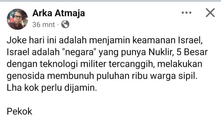 Joke hari ini adalah menjamin keamanan Israel, Israel adalah “negara” yang punya Nuklir, 5 Besar dengan teknologi militer tercanggih, melakukan genosida membunuh puluhan ribu warga sipil. Lha kok perlu dijamin. Pekok.