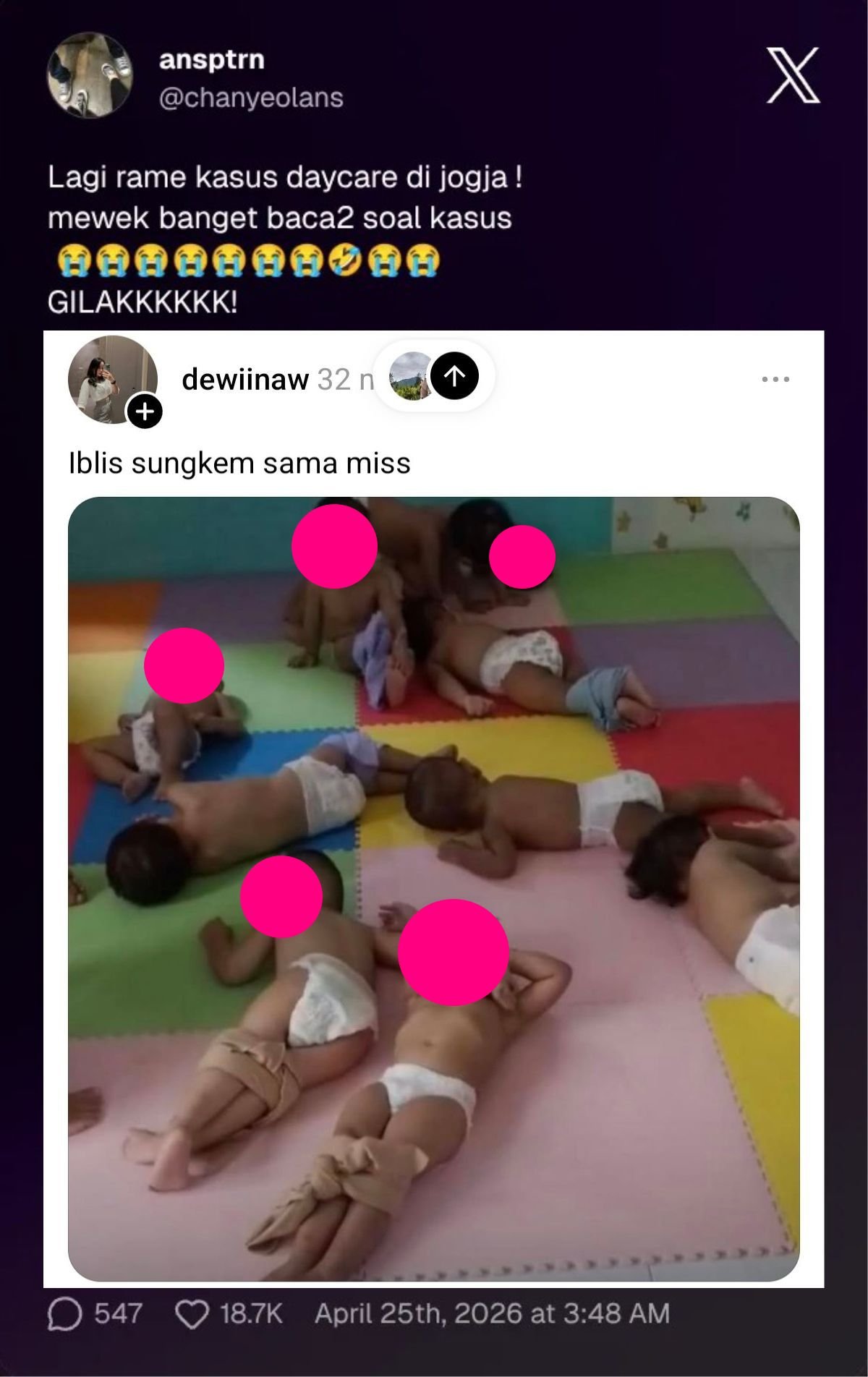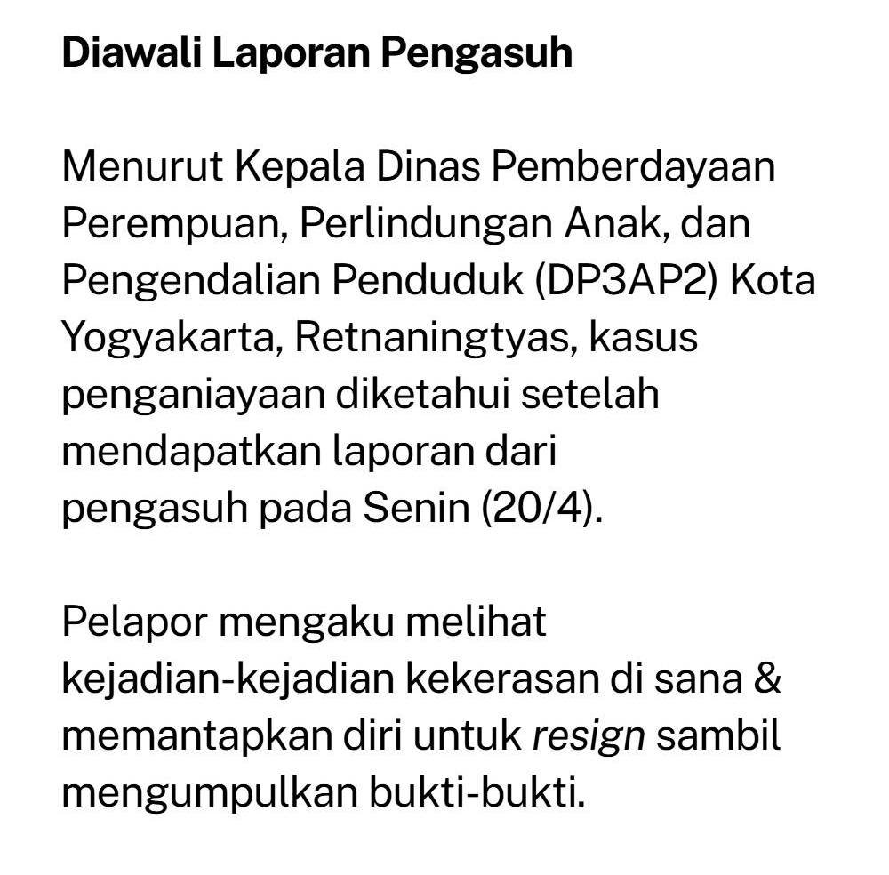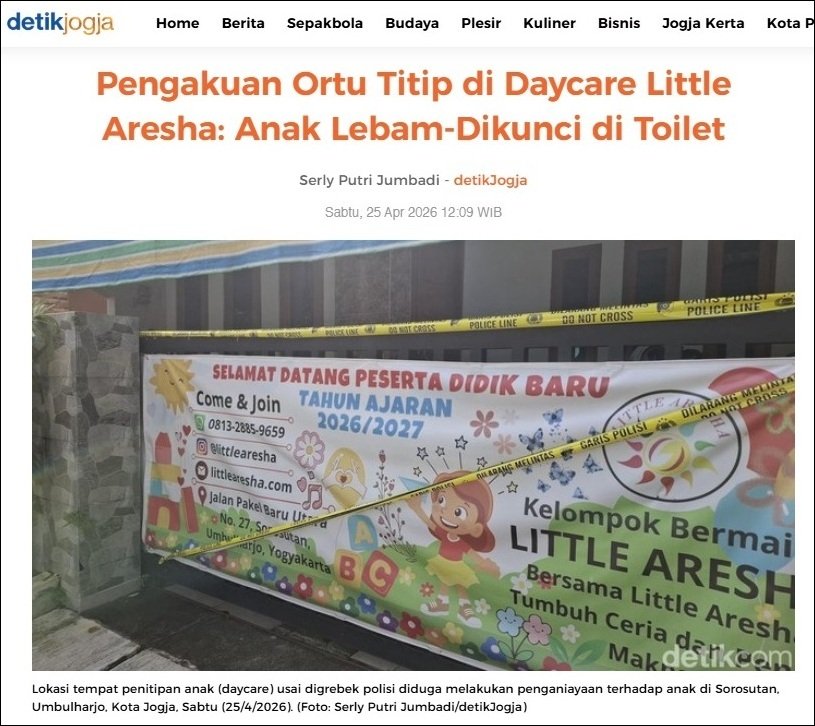 Kasus penganiayaan anak di Daycare Little Aresha, Sorosutan, Umbulharjo, Yogyakarta, baru-baru ini terbongkar setelah penggerebekan oleh pihak kepolisian pada Jumat, 24 April 2026.
