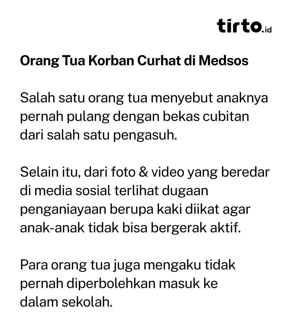 - Izin Ilegal/Bodong: Little Aresha diketahui tidak memiliki izin resmi dari instansi terkait untuk beroperasi sebagai tempat penitipan anak.