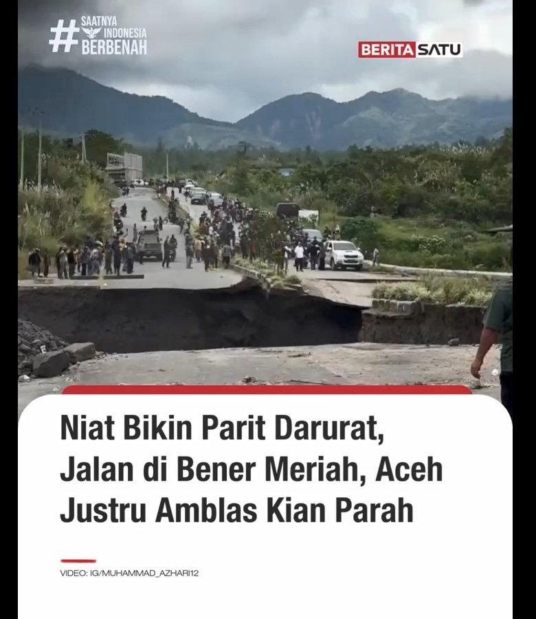 Upaya pembuatan parit darurat di Jalan Pacuan Kuda, Kabupaten Bener Meriah Aceh pada Rabu (3/12/2025) menggunakan ekskavator untuk mempercepat aliran air di sisi kanan jalan justru berujung fatal. Struktur tanah di bawah badan jalan yang ternyata hanya berupa pasir tidak mampu menahan gerusan air.