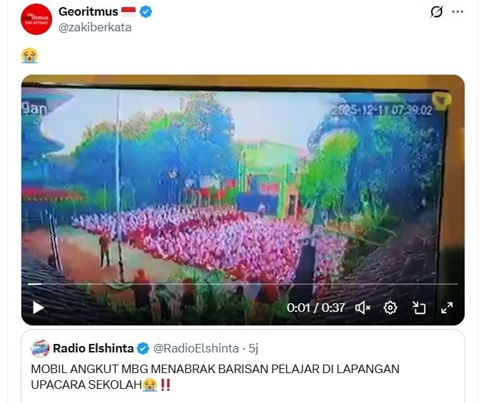 Sebuah mobil pengangkut makanan MBG tiba-tiba menerobos masuk ke lapangan upacara dan menabrak para siswa serta guru yang saat itu sedang berbaris dan mengikuti kegiatan belajar pagi.