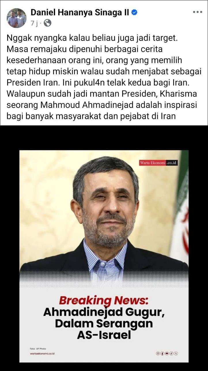 Media pemerintah Iran mengumumkan kematian mantan Presiden Mahmoud Ahmadinejad dalam serangan rudal yang menghantam ibu kota Teheran, Sabtu malam (28/2/2026).