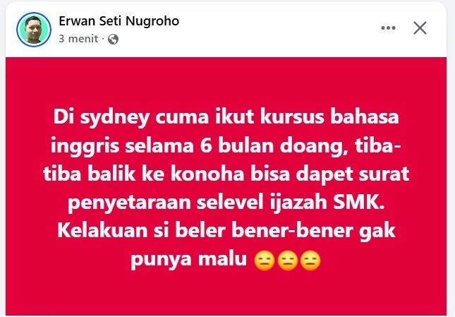 Di sydney cuma ikut kursus bahasa inggris selama 6 bulan doang, tiba-tiba balik ke konoha bisa dapet surat penyetaraan selevel ijazah SMK. Kelakuan si beler bener-bener gak punya malu πππ