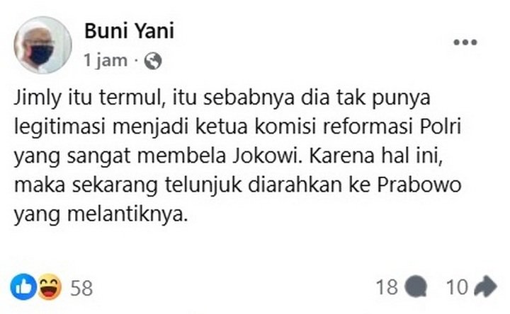 “Jimly itu termul, itu sebabnya dia tak punya legitimasi menjadi Ketua Komisi Reformasi Polri yang sangat membela Jokowi. Karena hal ini, maka sekarang telunjuk diarahkan ke Prabowo yang melantiknya,” ujar Buni Yani di akun media sosial facebook.
