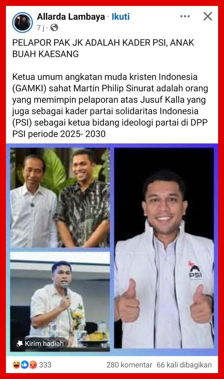 Ketua umum angkatan muda kristen Indonesia (GAMKI) Sahat Martin Philip Sinurat adalah orang yang memimpin pelaporan atas Jusuf Kalla yang juga sebagai kader partai solidaritas Indonesia (PSI) sebagai ketua bidang ideologi partai di DPP PSI periode 2025- 2030,” ujar akun fb Allarda Lambaya.