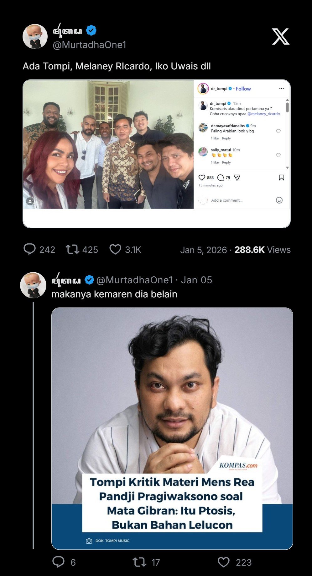 Kritik tersebut disampaikan Tompi melalui unggahan di akun Instagram pribadinya, @dr_tompi, menanggapi salah satu guyonan Pandji yang membahas kondisi fisik Wakil Presiden Gibran Rakabuming Raka.