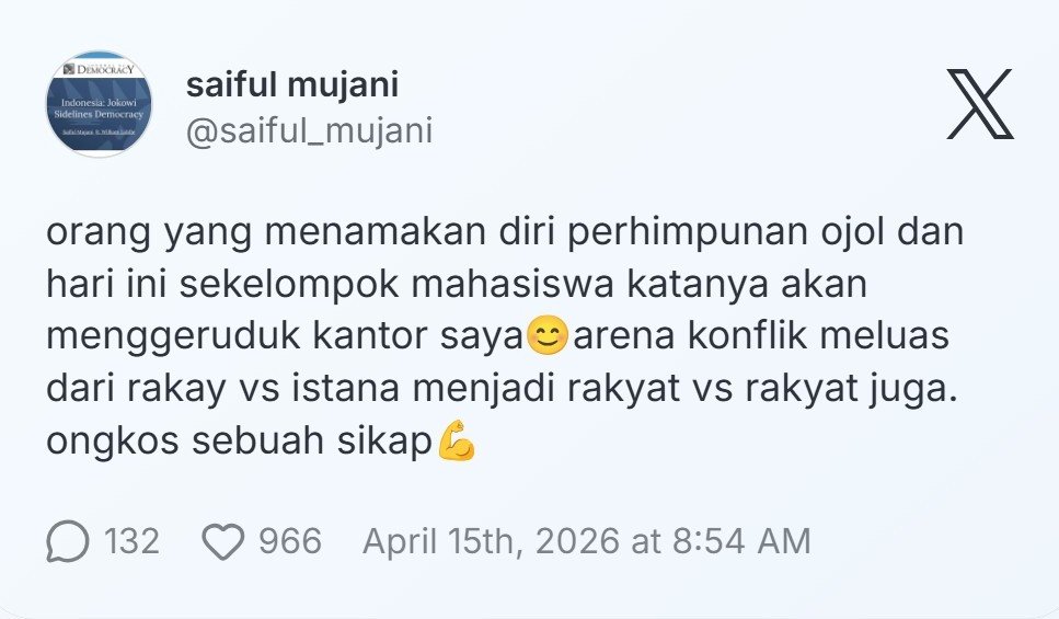 “orang yang menamakan diri perhimpunan ojol (demo kemarin -red), dan hari ini sekelompok mahasiswa katanya akan menggeruduk kantor saya😊 arena konflik meluas dari rakay vs istana menjadi rakyat vs rakyat juga. ongkos sebuah sikap💪,” ujar Saiful Mujani @saiful_mujani.