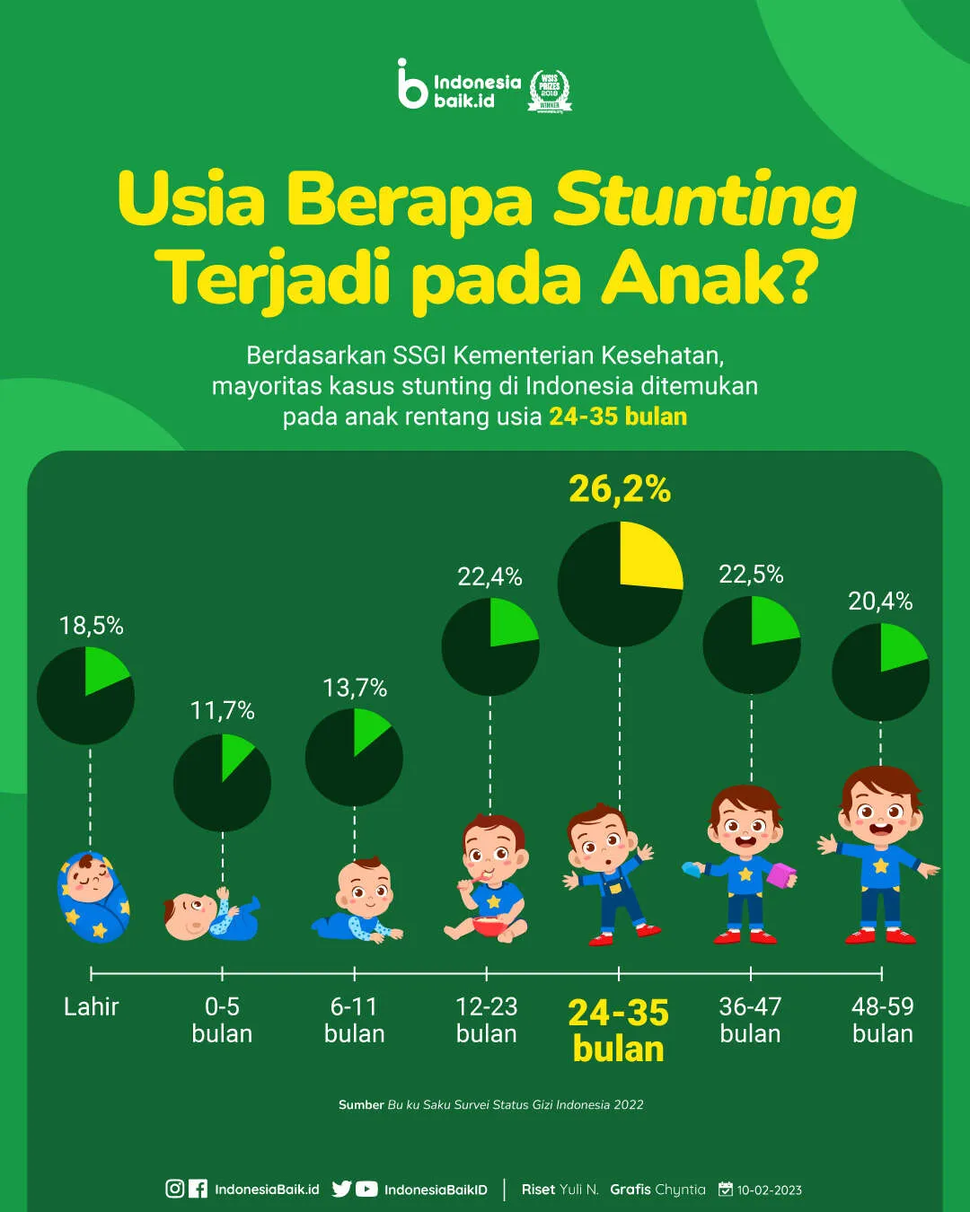 Berdasarkan SSGI Kementerian Kesehatan, mayoritas kasus stunting di Indonesia ditemukan pada anak rentang usia 24-35 bulan (anak usia 2 tahun – 2,9 tahun). SSGI mencatat mayoritas kasus stunting di Indonesia ditemukan pada anak rentang usia 24-35 bulan dengan persentase 26,2%.
