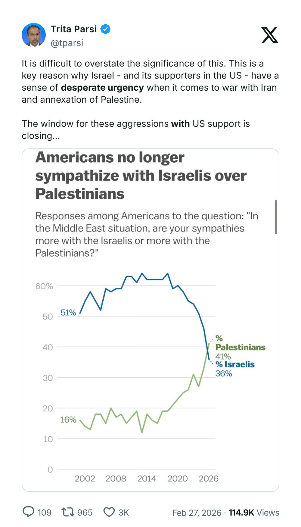 Padahal sebelum-sebelumnya, orang Amerika jauh lebih simpati dan mendukung Israel dibanding kepada Palestina. Yang mendukung Israel 51%, sedang yang mendukung/simpati ke Palestina hanya 16%.