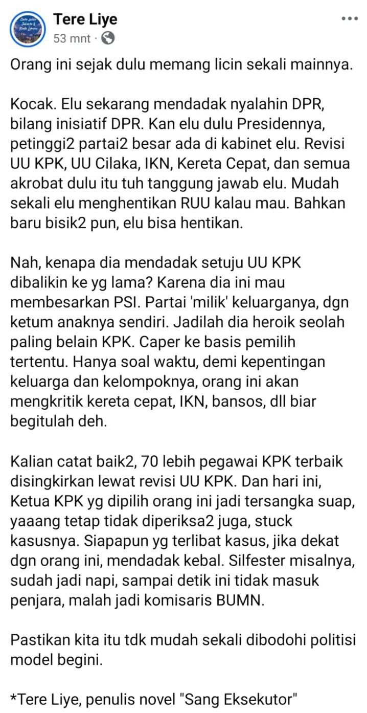Kocak. Elu sekarang mendadak nyalahin DPR, bilang inisiatif DPR. Kan elu dulu Presidennya, petinggi-petinggi partai-partai besar ada di kabinet elu. Revisi UU KPK, UU Cilaka, IKN, Kereta Cepat, dan semua akrobat dulu itu tuh tanggung jawab elu. Mudah sekali elu menghentikan RUU kalau mau. Bahkan baru bisik-bisik pun, elu bisa hentikan.