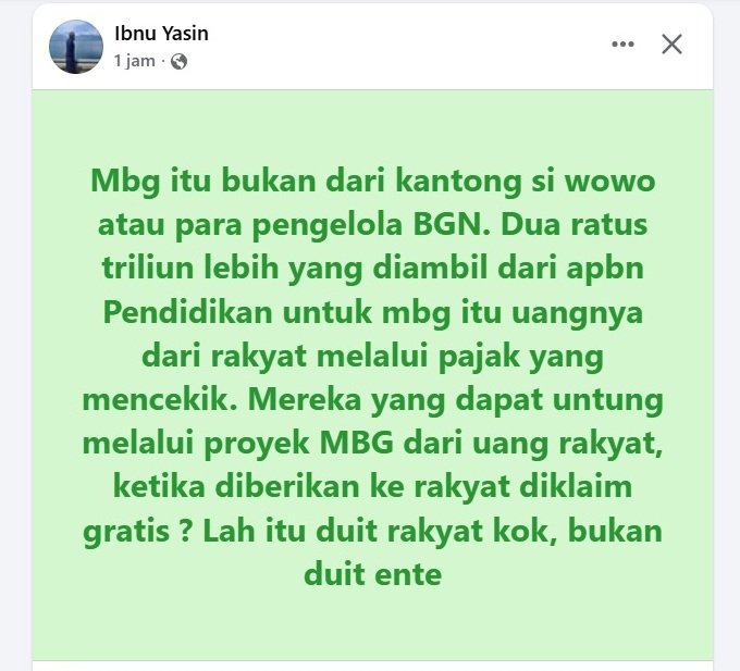 MBG itu bukan dari kantong si wowo atau para pengelola BGN. Dua ratus triliun lebih yang diambil dari APBN Pendidikan untuk MBG itu uangnya dari rakyat melalui pajak yang mencekik. Mereka yang dapat untung melalui proyek MBG dari uang rakyat, ketika diberikan ke rakyat diklaim gratis ? Lah itu duit rakyat kok, bukan duit ente.