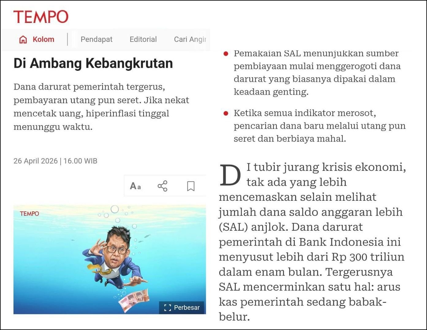 Itulah situasi ekonomi keluarga Pak Indo. Dia jelas tidak akan mau mengakuinya. Denial habis-habisan. Dia pasti bilang baik-baik saja. Semua aman sentosa. Optimis. Tapi ekonomi tekor itu TIDAK bisa ditutup dgn kata-kata indah.