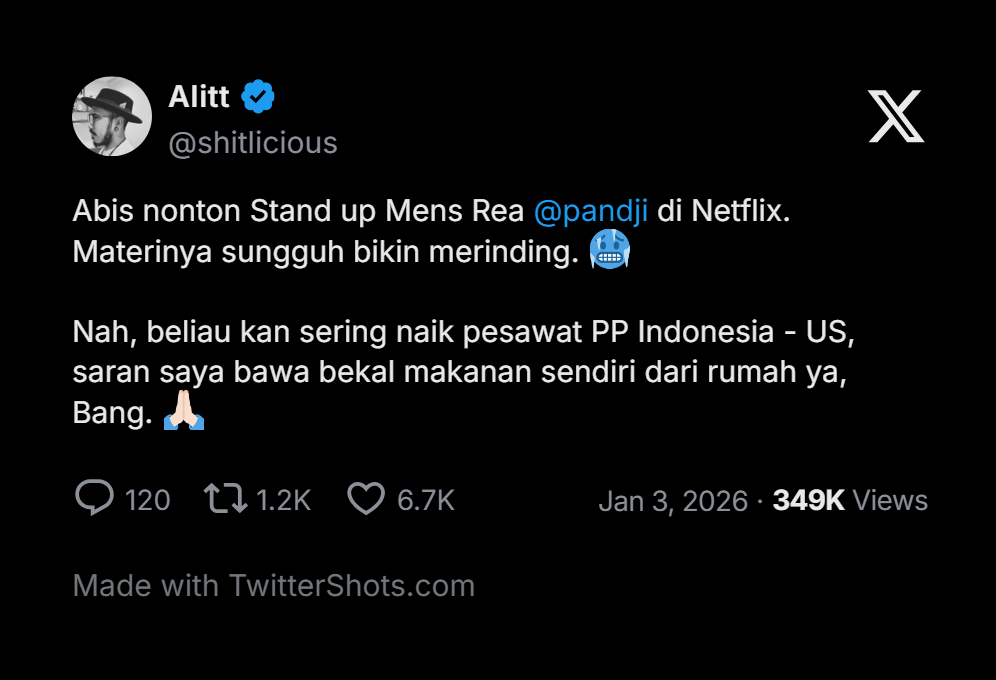 Nah, beliau kan sering naik pesawat PP Indonesia – US, saran saya bawa bekal makanan sendiri dari rumah ya, Bang. 🙏🏻,” cuit akun X @shitlicious.
