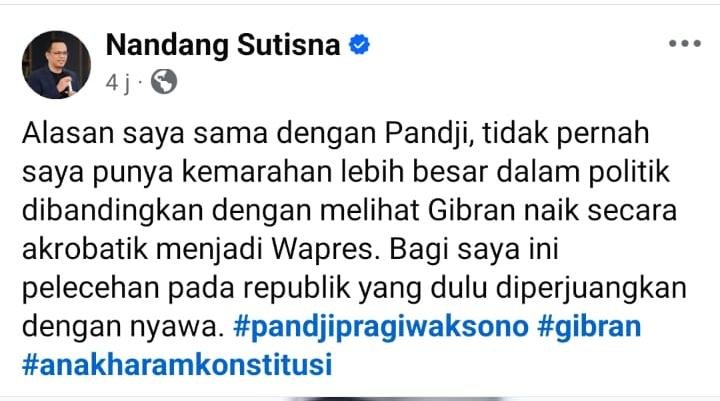 Alasan saya sama dengan Pandji, tidak pernah saya punya kemarahan lebih besar dalam politik dibandingkan dengan melihat Gibran naik secara akrobatik menjadi Wapres. Bagi saya ini pelecehan pada republik yang dulu diperjuangkan dengan nyawa.