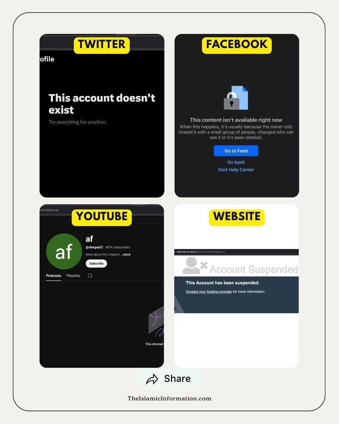 - Platform yang Dinonaktifkan: Situs web resmi (alfawzan.af.org.sa) sudah tidak dapat diakses, akun Twitter dengan hampir satu juta pengikut telah dihapus, dan saluran YouTube-nya juga telah lenyap.
