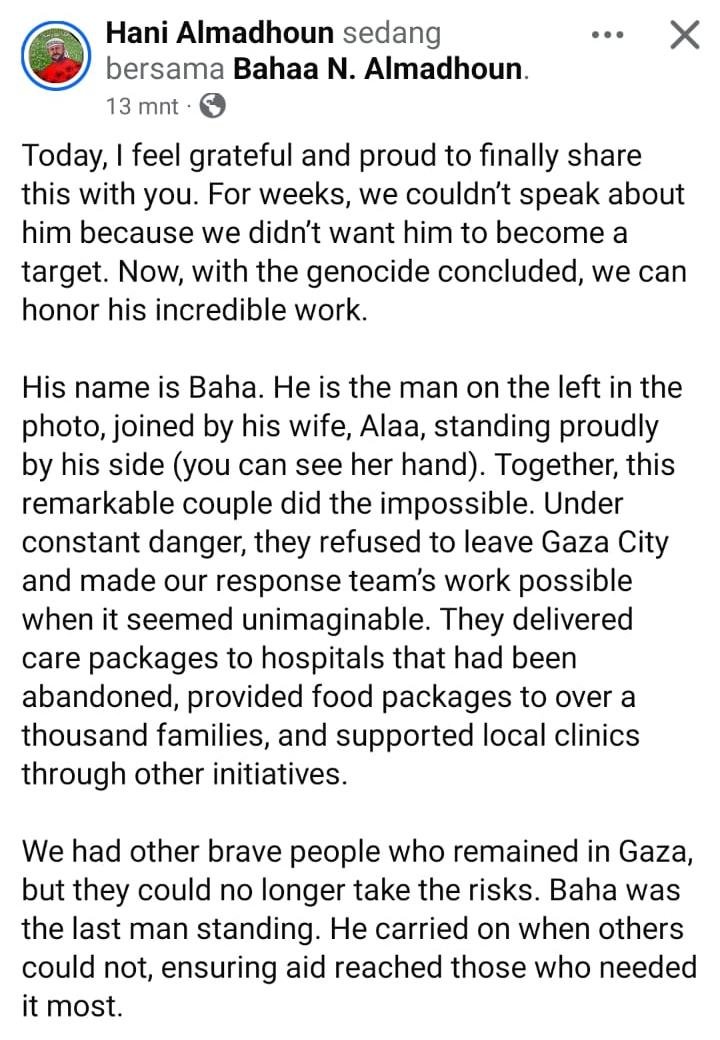 Kami memiliki orang-orang pemberani lainnya yang tetap tinggal di Gaza, tetapi mereka tak sanggup lagi mengambil risiko. Baha adalah orang terakhir yang bertahan (The Last Man Standing). Ia terus berjuang ketika yang lain tak mampu, memastikan bantuan menjangkau mereka yang paling membutuhkan.