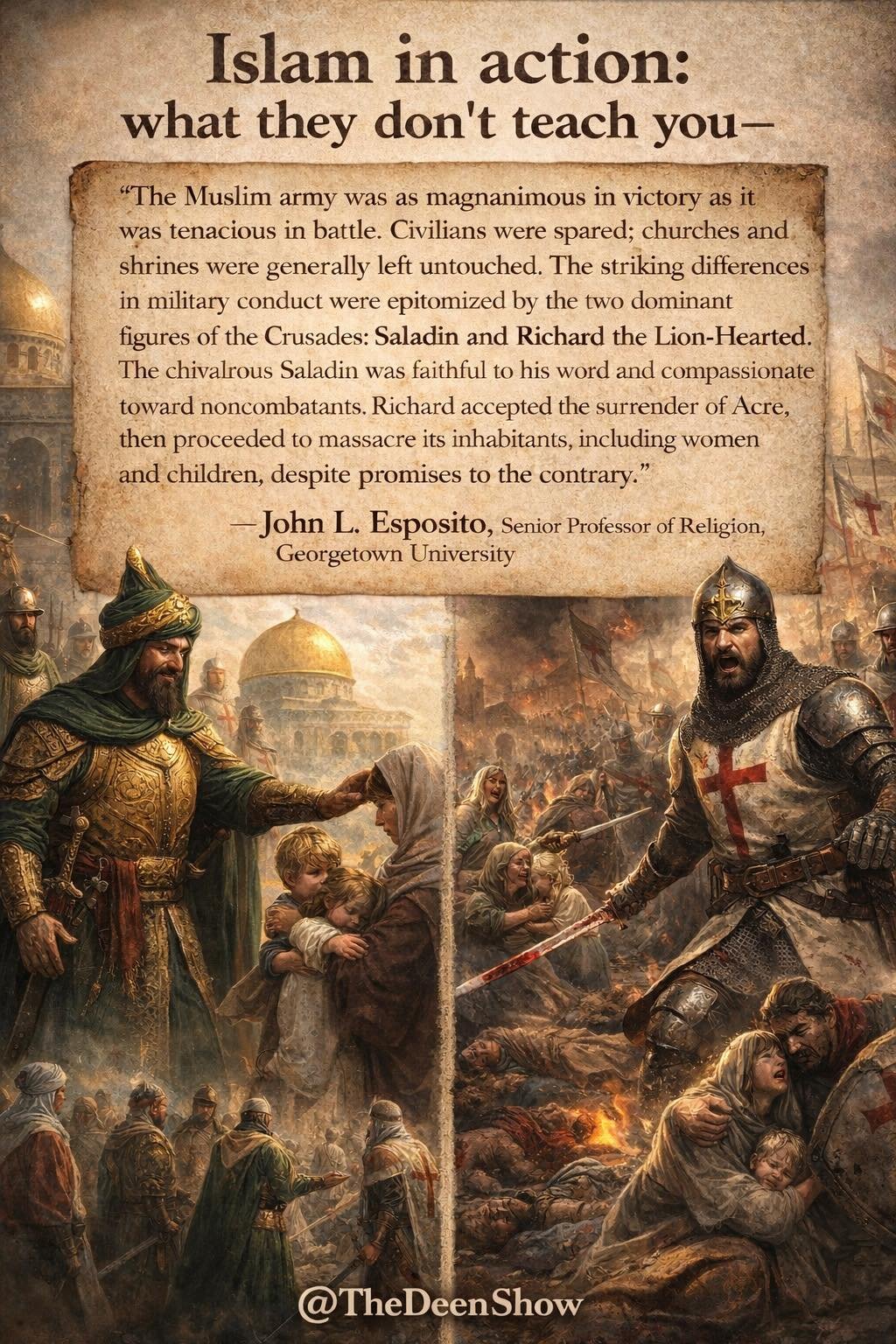 Perbedaan mencolok dalam perilaku militer diwujudkan oleh dua tokoh dominan Perang Salib: Salahuddin dan Richard si Hati Singa.