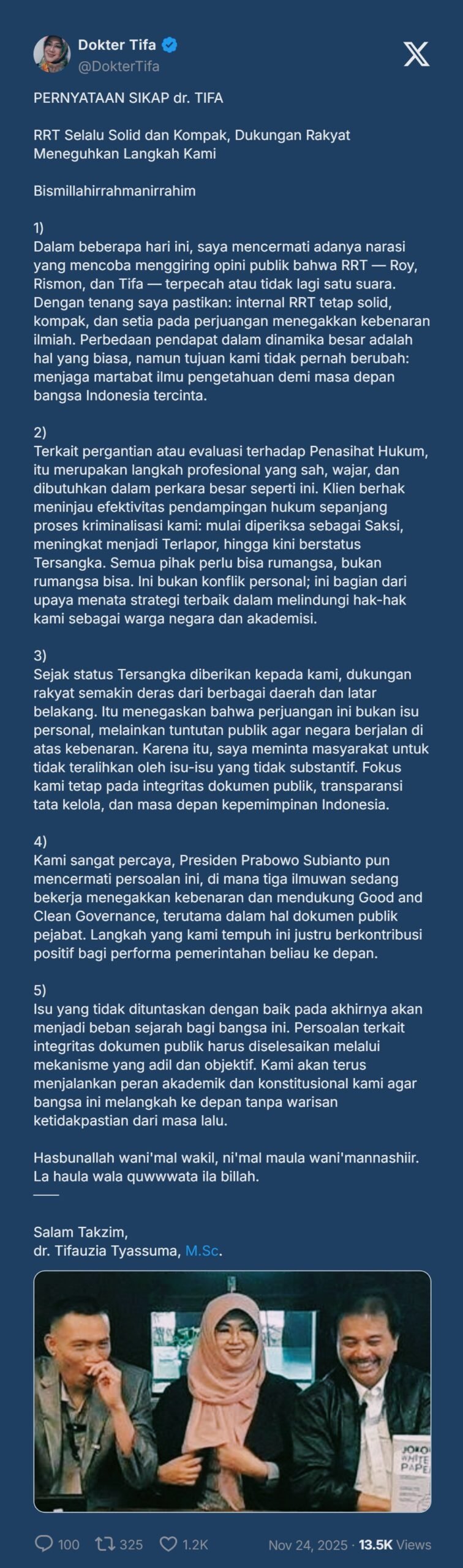 1) Dalam beberapa hari ini, saya mencermati adanya narasi yang mencoba menggiring opini publik bahwa RRT — Roy, Rismon, dan Tifa — terpecah atau tidak lagi satu suara. Dengan tenang saya pastikan: internal RRT tetap solid, kompak, dan setia pada perjuangan menegakkan kebenaran ilmiah. Perbedaan pendapat dalam dinamika besar adalah hal yang biasa, namun tujuan kami tidak pernah berubah: menjaga martabat ilmu pengetahuan demi masa depan bangsa Indonesia tercinta.