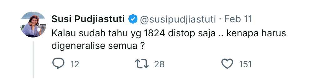 “Kalau sudah tahu yg 1824 distop saja .. kenapa harus digeneralise semua ?” ujar Bu Susi Pudjiastuti di akun X @susipudjiastuti.