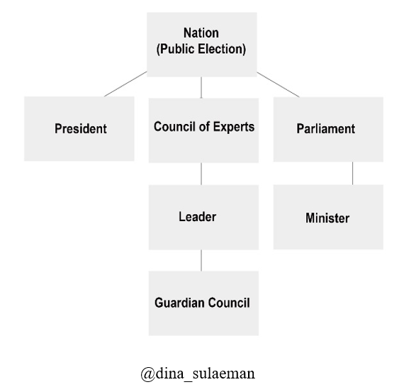 Eksekutif dijalankan oleh Presiden, Legislatif oleh Parlemen. Tugas Leader dirinci di UUD Iran, namun secara umum karena yang bisa dipilih sebagai Leader adalah ulama level Ayatullah (ini gelar tertinggi keilmuan agama di Iran), ia menjadi “penjaga revolusi”, jangan sampai demokrasi melenceng, keluar dari nilai-nilai Islam. Kinerjanya diawasi oleh para anggota Dewan Pakar dan jika melanggar hukum (ada detilnya di UU), dia mungkin saja dilengserkan.