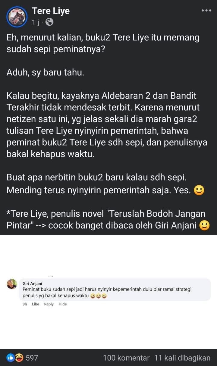 - Masalah Bajakan: Tere Liye sering vokal mengenai pembajakan buku di marketplace. Hal ini menunjukkan bukunya sangat dicari, namun penjualannya terganggu oleh barang bajakan.