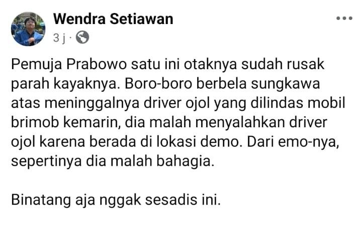 Pemuja Prabowo satu ini otaknya sudah rusak parah kayaknya. Boro-boro berbela sungkawa atas meninggalnya driver ojol yang dilindas mobil brimob kemarin, dia malah menyalahkan driver ojol karena berada di lokasi demo. Dari emo-nya, sepertinya dia malah bahagia.