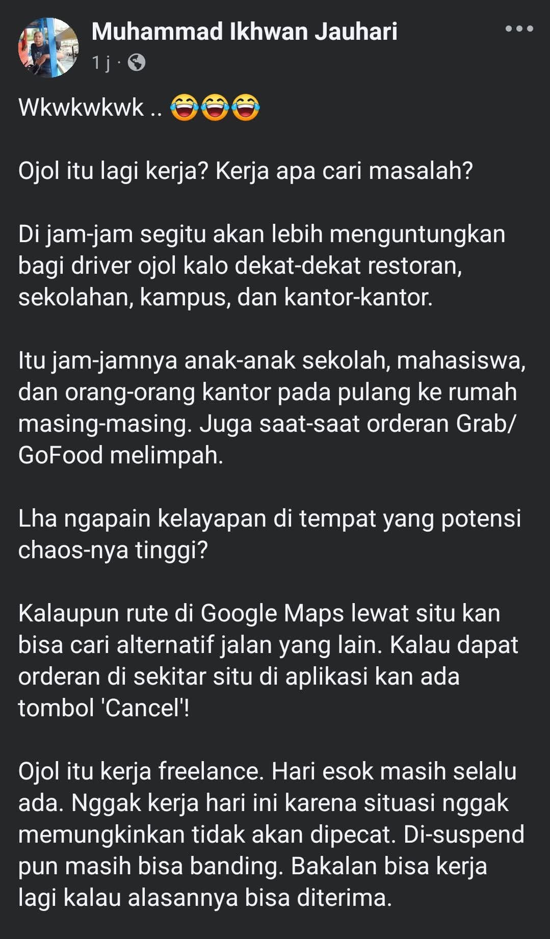 Pemuja Prabowo satu ini otaknya sudah rusak parah kayaknya. Boro-boro berbela sungkawa atas meninggalnya driver ojol yang dilindas mobil brimob kemarin, dia malah menyalahkan driver ojol karena berada di lokasi demo. Dari emo-nya, sepertinya dia malah bahagia.