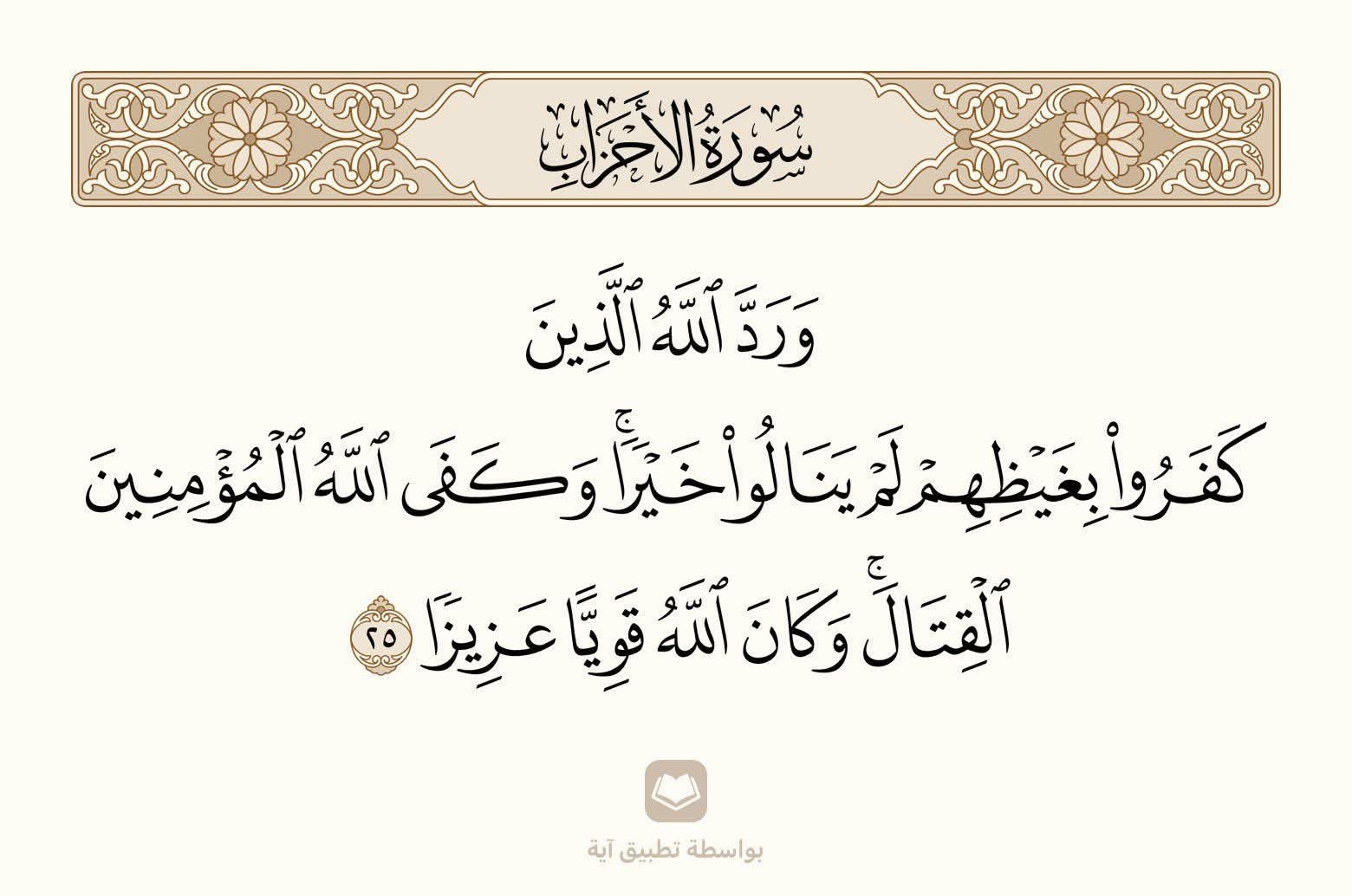 وَرَدَّ ٱللَّهُ ٱلَّذِينَ كَفَرُواْ بِغَيۡظِهِمۡ لَمۡ يَنَالُواْ خَيۡرٗاۚ وَكَفَى ٱللَّهُ ٱلۡمُؤۡمِنِينَ ٱلۡقِتَالَۚ وَكَانَ ٱللَّهُ قَوِيًّا عَزِيزٗا